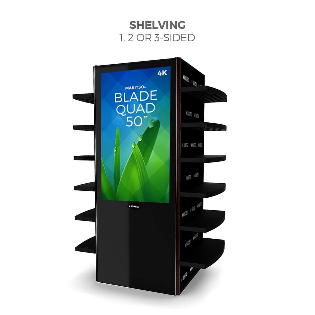 Discover the Makitso® Blade Quad digital signage kiosk with optional touch screen display solutions and create a lasting impression in the mind of your audience through personal interactive experiences. Add-on shelves for retail merchandising and product showcase. Hide-away shelving for overstock or storage.