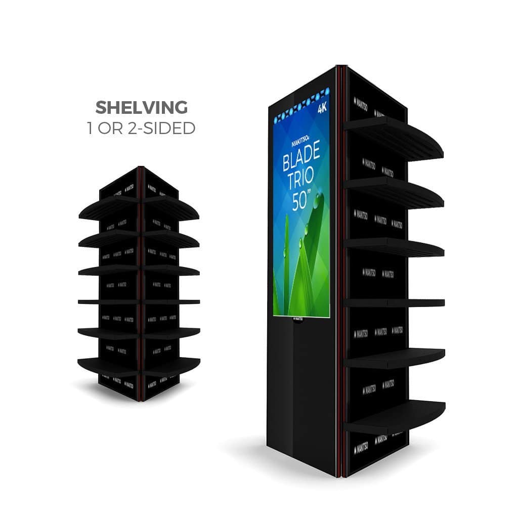 Discover the Makitso® Blade Trio digital signage kiosk with add-on touch screen display solutions and create a lasting impression in the mind of your audience through personal interactive experiences. Add-on shelves for retail merchandising and product showcase.