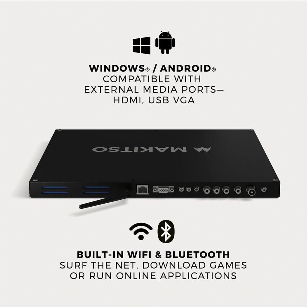 Makitso® Sslab Jr Interactive Table with 32” 10 Point Touch Screen Display and built-in 16AH Rechargeable Battery. Download Android Apps to play games, educate and learn or load your own branded app to showcase product and services. The Makitso® Sslab Jr has a kid-friendly outer shell that’s durable and easy to maintain. The touch screen overlay is impact resistant and spill proof. Position the table horizontally or vertically to use 4k Interactive display or detach the display from the base to mount onto a wall, counter top or other surface. Power by outlet or 16AH rechargeable battery.