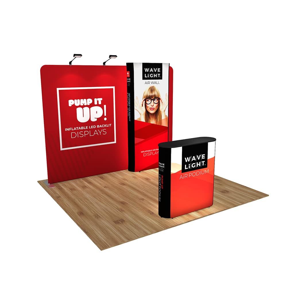 The WaveLight® Air Wall Kit is an eye-catching combination of backlit inflatable displays backed by a lightweight tension fabric display wall. The WaveLight® Air Wall and Podium draw consumers attention with bright LED’s that flood the fabric graphics while the WaveLine® Display Wall creates a focal point for branding your business.
