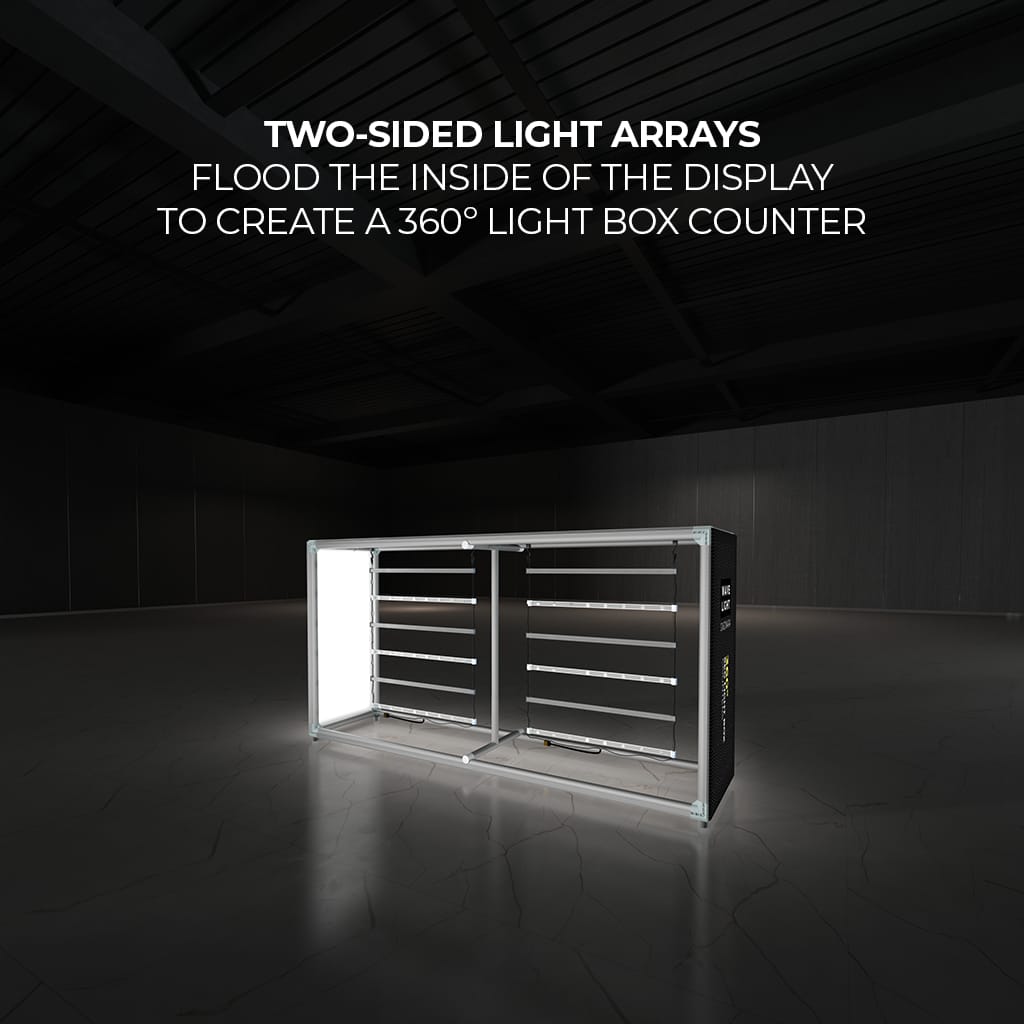 Breathe new light into your brand, exhibit, event or retail shop with the WaveLight® Casonara SEG Light Counters. This pioneering new SEG tension fabric light box is designed to make backlit graphics more portable, modular and customizable. Our 360º illumination technology provides more visibility for your brand and more places to present your ideas. We have also colour coded the frames which provides our users the ability to quickly assemble and disassemble the display without tools – or breaking a sweat.