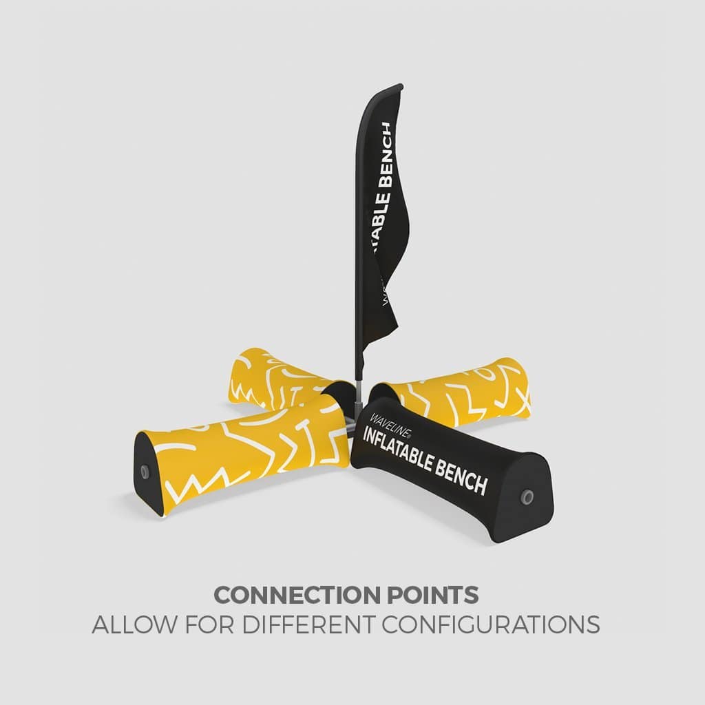 WaveLine® Inflatable Bench – Portable indoor/outdoor modular seating. Go from flat packed to fully inflated in under 30 seconds. The WaveLine® Inflatable Bench has an inner core that’s durable and strong. A self-locking quick-release air valve makes it easy to inflate without loosing air and just as easy to deflate with the push of a button. Connect multiple benches together in a variety of configurations. Connection points offer a placement of flags, counter tops or small signage to be added.